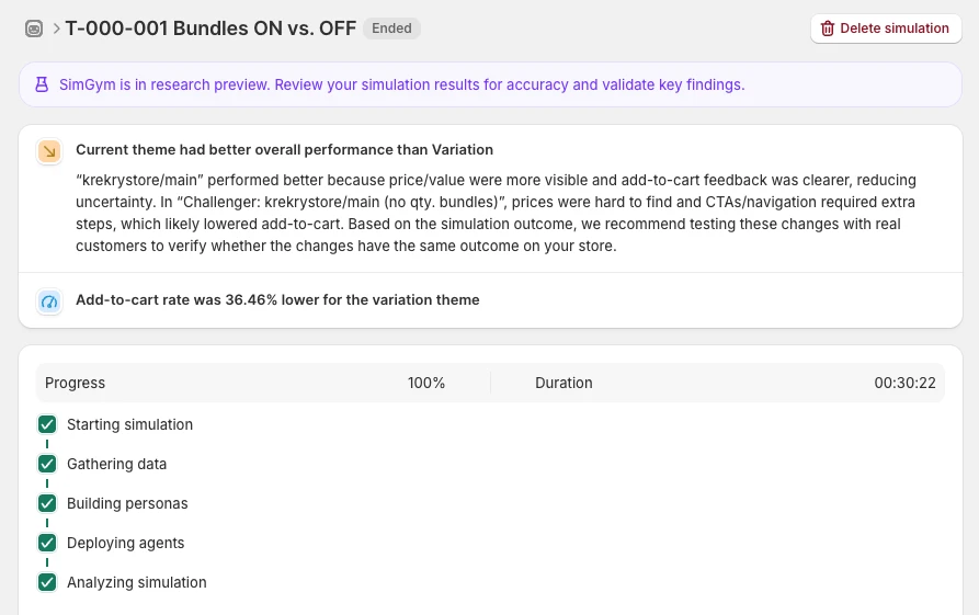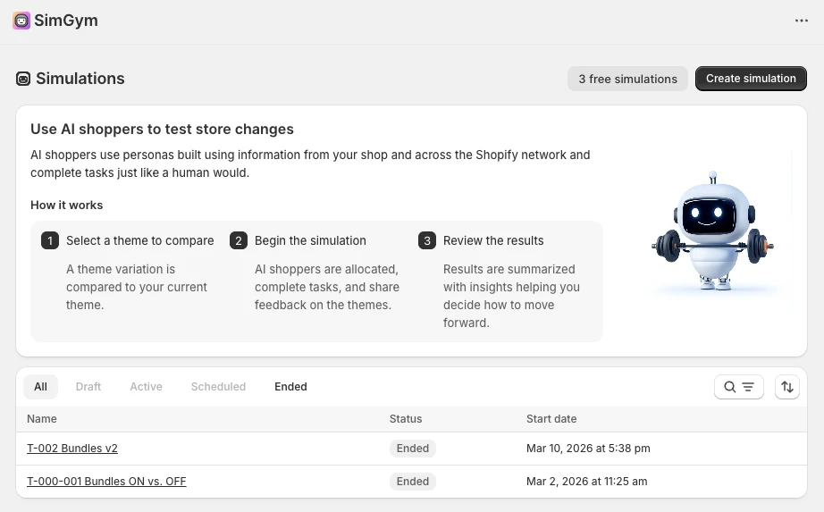 Contrairement aux outils de test A/B traditionnels tels que Intelligems qui divise le trafic réel de votre boutique, SimGym ne vous permettra pas de tester une version par rapport à une autre sur les vrais visiteurs de votre boutique. Shopify déploie plutôt Agents d'IA (bots) pour simuler le trafic vers chaque variante de thème.
