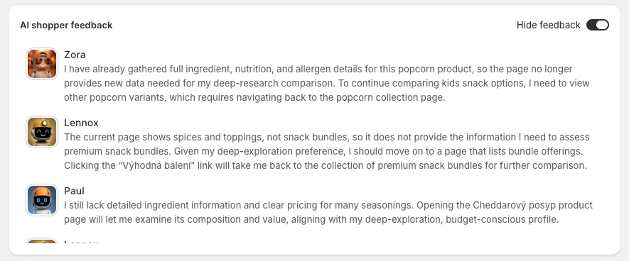 Une fois que le test commence, c'est plutôt cool. Vous pouvez voir les agents IA déployés et lire leurs commentaires en temps réel lorsqu'ils parcourent la boutique. C'est presque comme si de vrais visiteurs passaient par votre site.